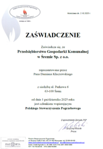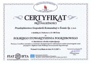 Przedsiębiorstwo Gospodarki Komunalnej posiada Certyfikat przynależności do Polskiego Stowarzyszenia Pogrzebowego co świadczy o głębokim zaangażowaniu oraz stosownych kompetencjach w wykonywaniu powierzonych zadań.